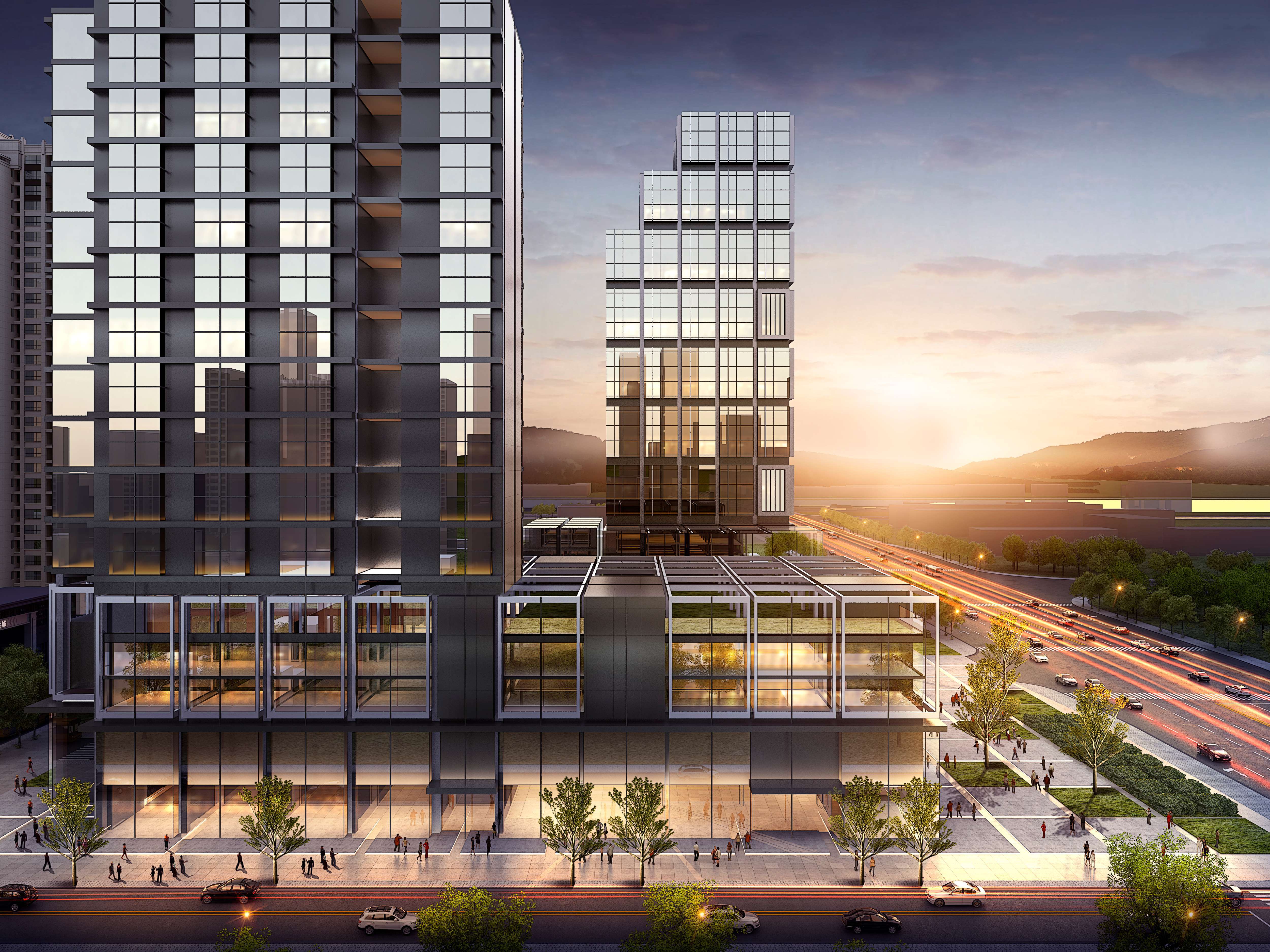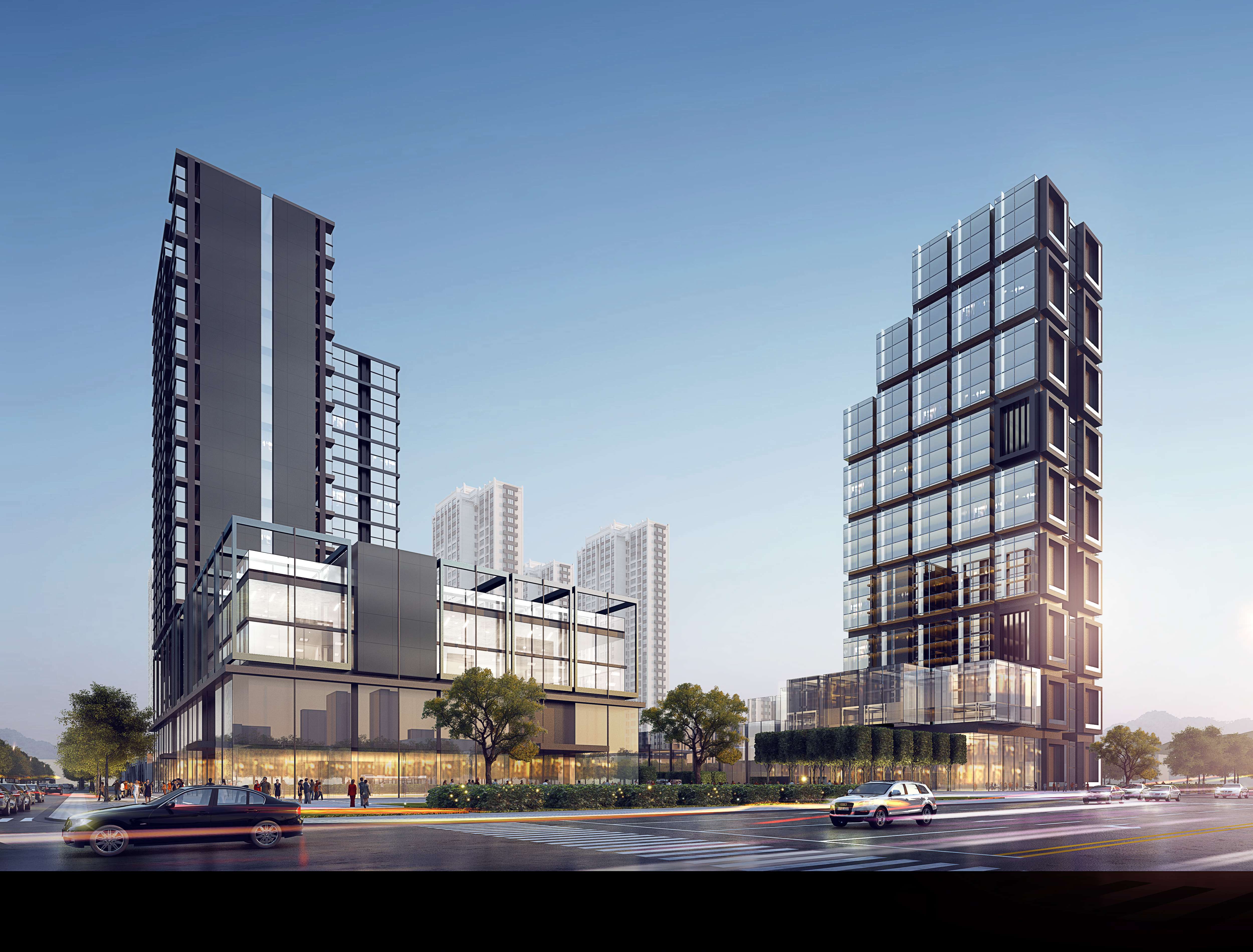外立面设计体现企业产品的模块化、科技化,控制合理造价的情况下,做出现代新颖的外观造型。